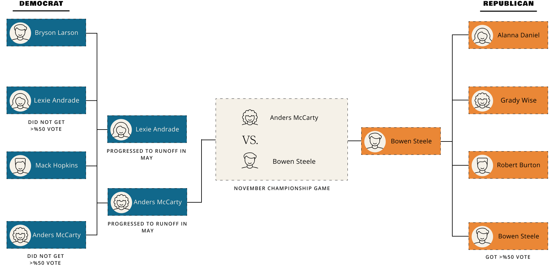 Primary winners compete. Person with the most votes becomes the elected official.